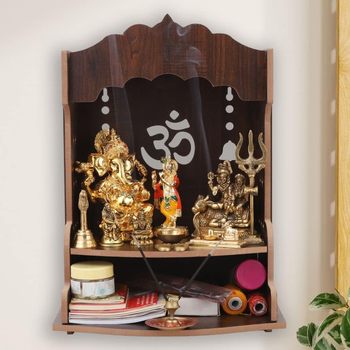 घर की दीवार के लिए भारतीय पूजा लकड़ी का मंदिर, दो शेल्फ और उत्कीर्ण देवता मूर्तियों की सजावट के साथ लटका हुआ लकड़ी पूजा मंदिर